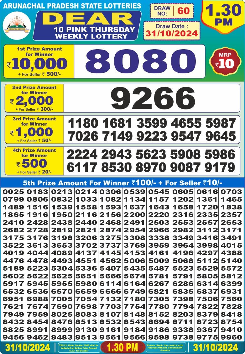 Dear 10 pink lottery 1.30PM Result 31/10/24