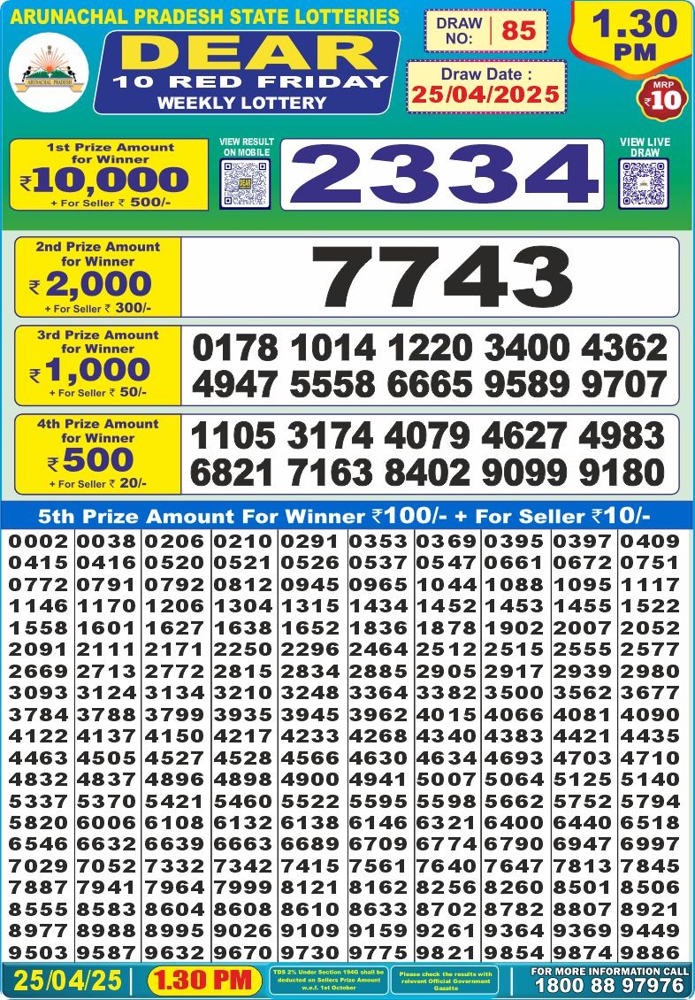 Dear 10 red lottery 1.30PM Result 25.4.25