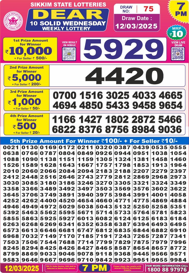 Nagaland State Lotteries was established in the year 1972 under the supervision of the Finance Department to generate a dependable source of revenue for the State Government. Nagaland State Lottery is held every day of the week at three different times of the day, Morning, Day, and Evening. Every day, the lottery is held under a different name with some difference in the prize money with the top prize worth ₹1 Crore (including Super Prize amount). The daily lotteries hosted by Nagaland State include Dear Morning Lottery, Dear Day Lottery, and Dear Evening Lottery which costs 6 Rupees for each ticket.