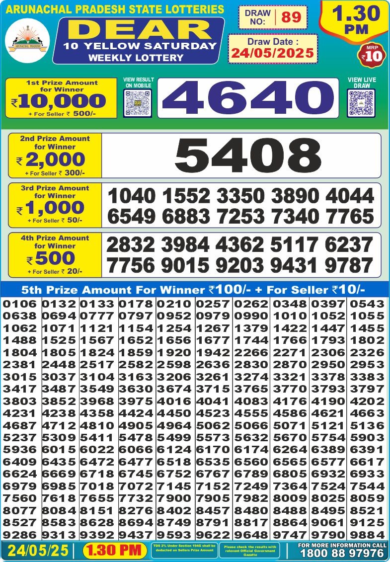 Dear 10 yellow lottery 1.30PM Result 24.05.25