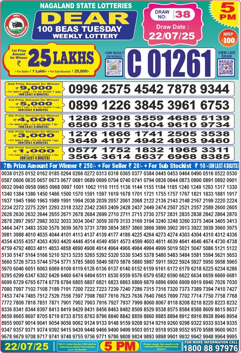 Nagaland State Lotteries was established in the year 1972 under the supervision of the Finance Department to generate a dependable source of revenue for the State Government. Nagaland State Lottery is held every day of the week at three different times of the day, Morning, Day, and Evening. Every day, the lottery is held under a different name with some difference in the prize money with the top prize worth ₹1 Crore (including Super Prize amount). The daily lotteries hosted by Nagaland State include Dear Morning Lottery, Dear Day Lottery, and Dear Evening Lottery which costs 6 Rupees for each ticket.