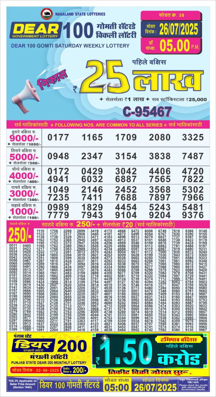 Dear 100 Gomti saturday Lottery 5pm Result  26.07.2025