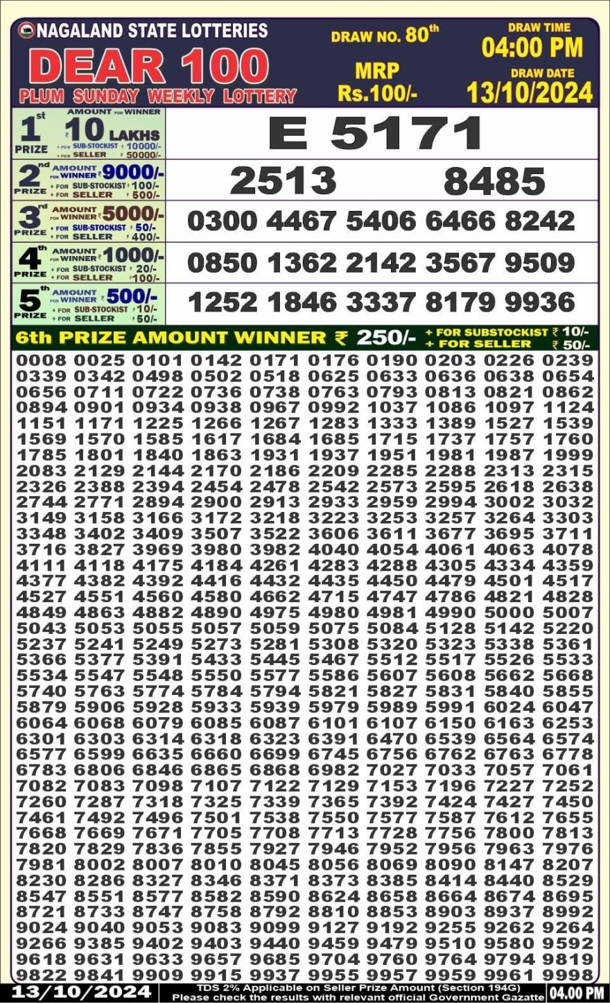 Dear 100 plum sunday  Lottery 4pm Result  13.10.2024