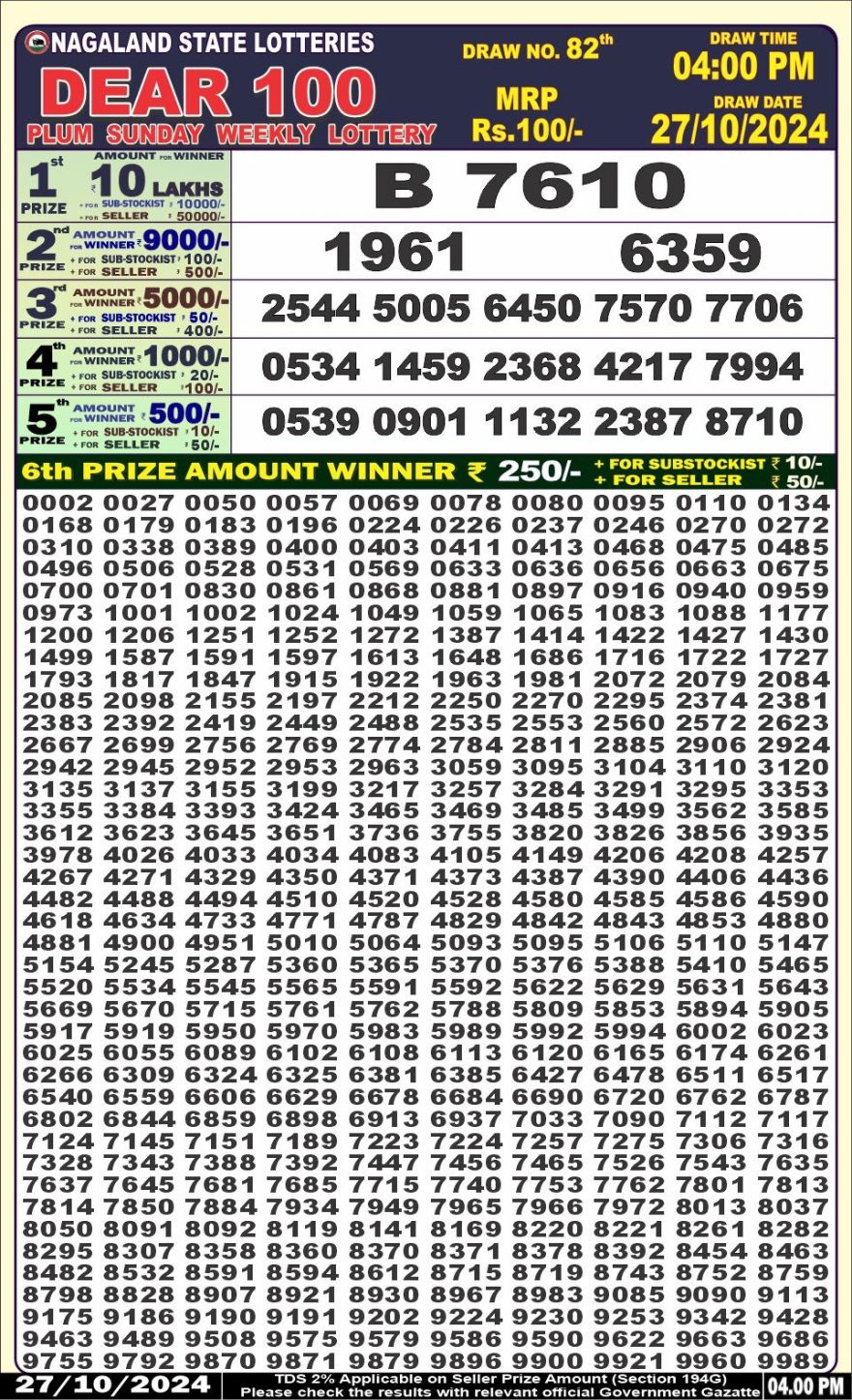 Dear 100 plum sunday  Lottery 4pm Result  27.10.2024