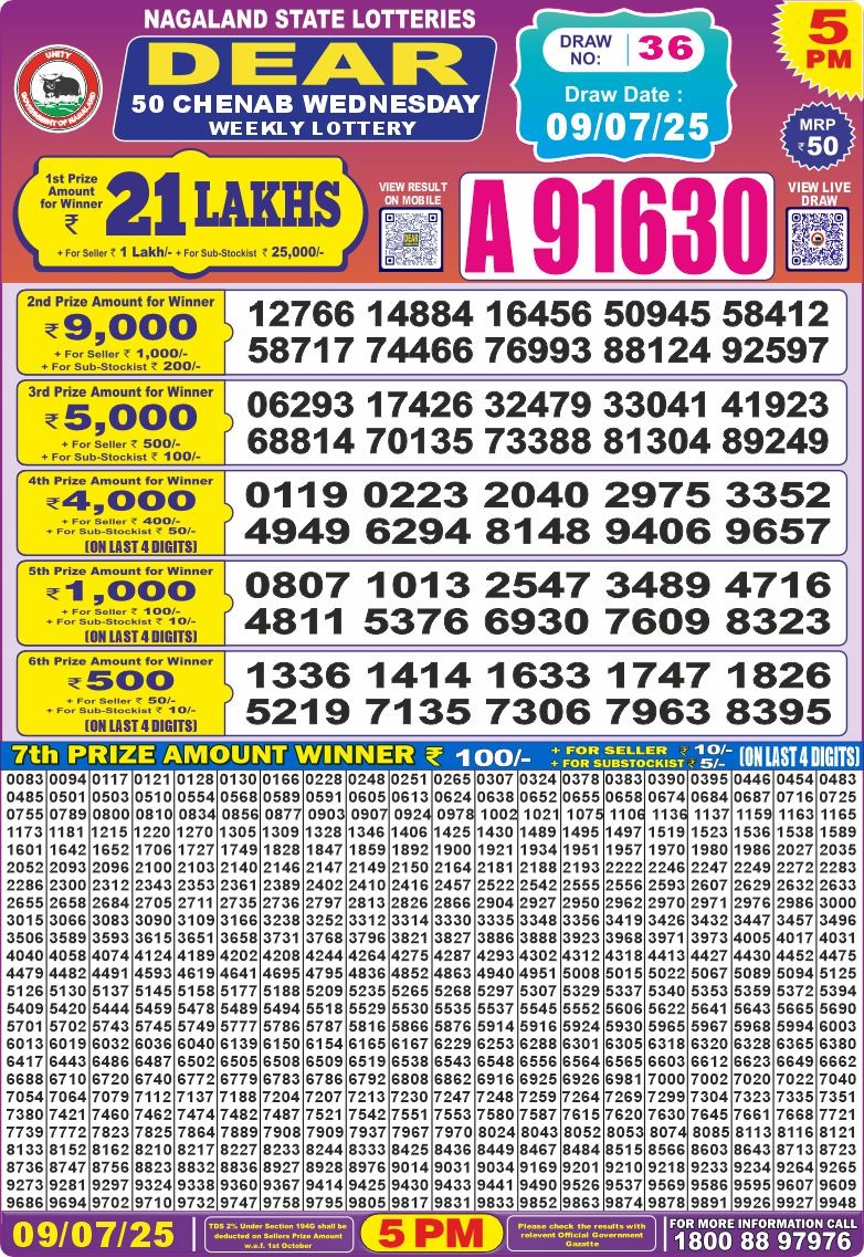 Dear 50 Chenab 5pm Wednesday Lottery Result 09.07.2025