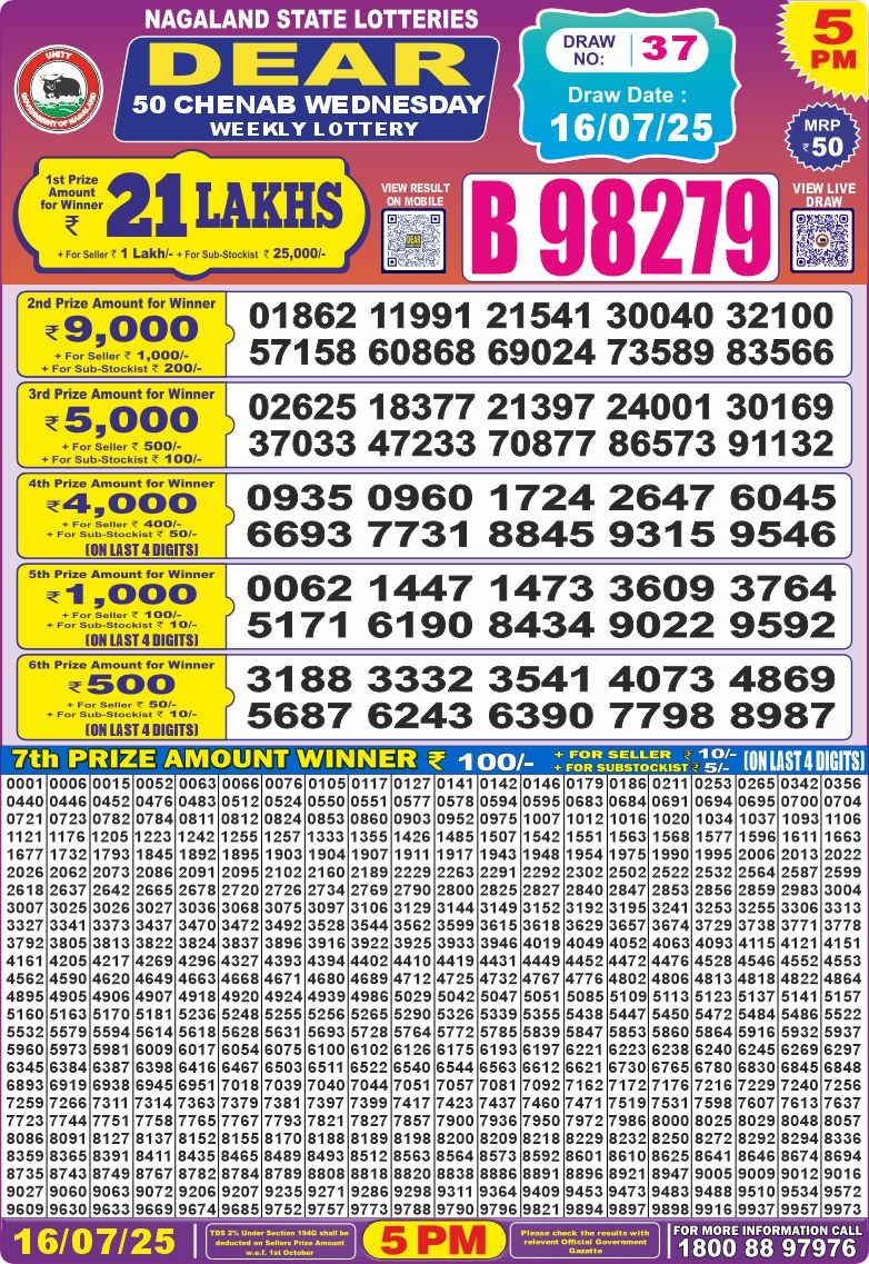 Dear 50 Chenab 5pm Wednesday Lottery Result 16.07.2025