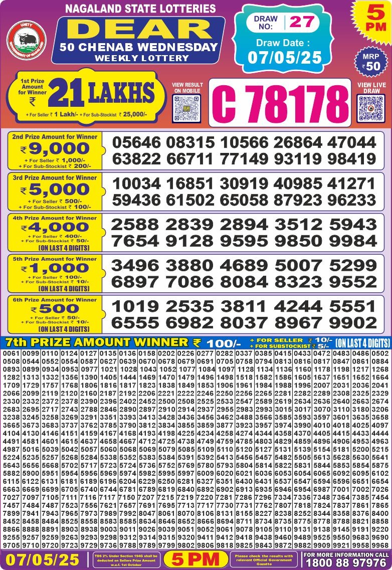 Dear 50 Chenab 5pm Wednesday Lottery Result 7.5.25