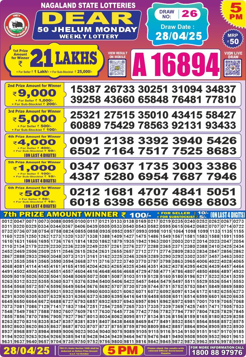 Dear 50 jhelum monday Lottery 5pm Result  28.4.25