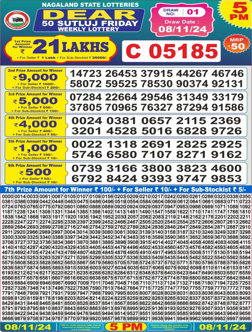 Nagaland State Lotteries was established in the year 1972 under the supervision of the Finance Department to generate a dependable source of revenue for the State Government. Nagaland State Lottery is held every day of the week at three different times of the day, Morning, Day, and Evening. Every day, the lottery is held under a different name with some difference in the prize money with the top prize worth ₹1 Crore (including Super Prize amount). The daily lotteries hosted by Nagaland State include Dear Morning Lottery, Dear Day Lottery, and Dear Evening Lottery which costs 6 Rupees for each ticket.