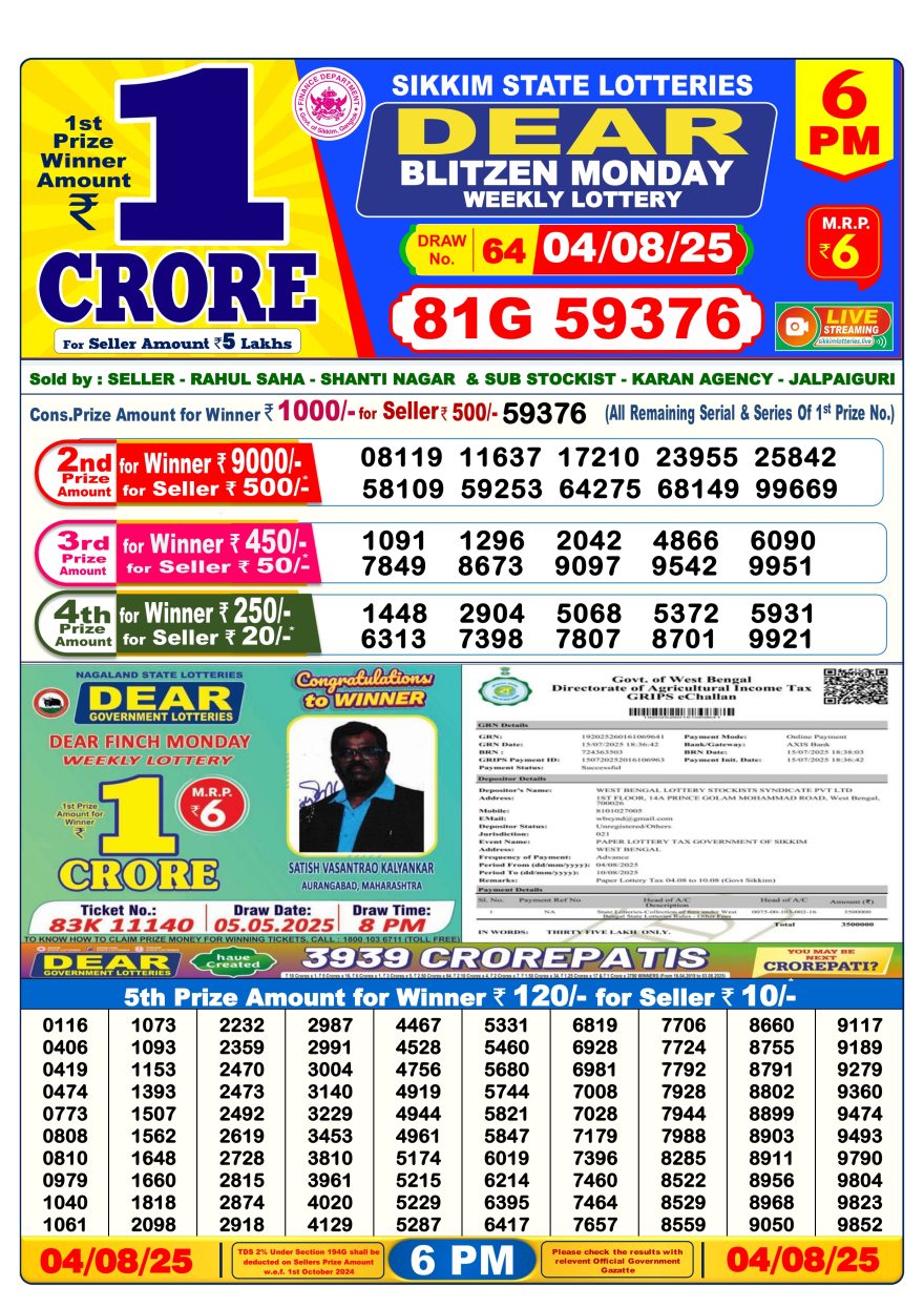 Dear Blitzen Monday Weekly 6pm Result 04.08.2025