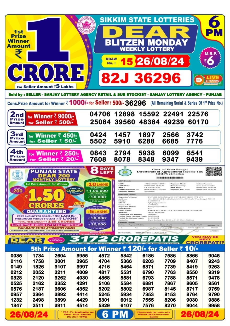 Dear blitzen monday weekly  6PM Result 26.08.24