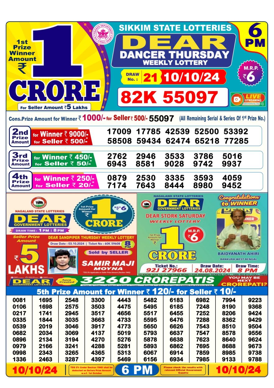 Nagaland State Lotteries was established in the year 1972 under the supervision of the Finance Department to generate a dependable source of revenue for the State Government. Nagaland State Lottery is held every day of the week at three different times of the day, Morning, Day, and Evening. Every day, the lottery is held under a different name with some difference in the prize money with the top prize worth ₹1 Crore (including Super Prize amount). The daily lotteries hosted by Nagaland State include Dear Morning Lottery, Dear Day Lottery, and Dear Evening Lottery which costs 6 Rupees for each ticket.