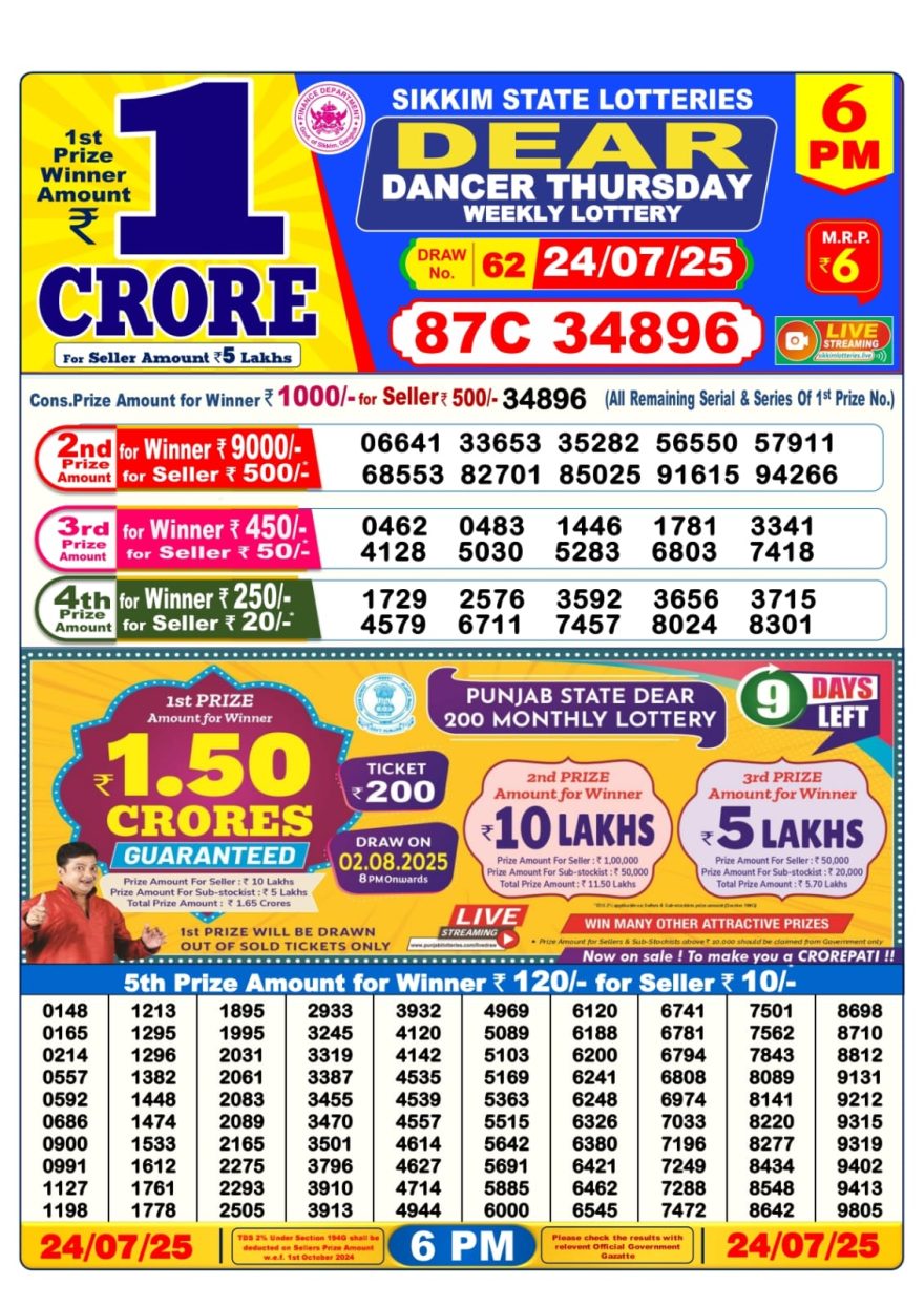 Nagaland State Lotteries was established in the year 1972 under the supervision of the Finance Department to generate a dependable source of revenue for the State Government. Nagaland State Lottery is held every day of the week at three different times of the day, Morning, Day, and Evening. Every day, the lottery is held under a different name with some difference in the prize money with the top prize worth ₹1 Crore (including Super Prize amount). The daily lotteries hosted by Nagaland State include Dear Morning Lottery, Dear Day Lottery, and Dear Evening Lottery which costs 6 Rupees for each ticket.
