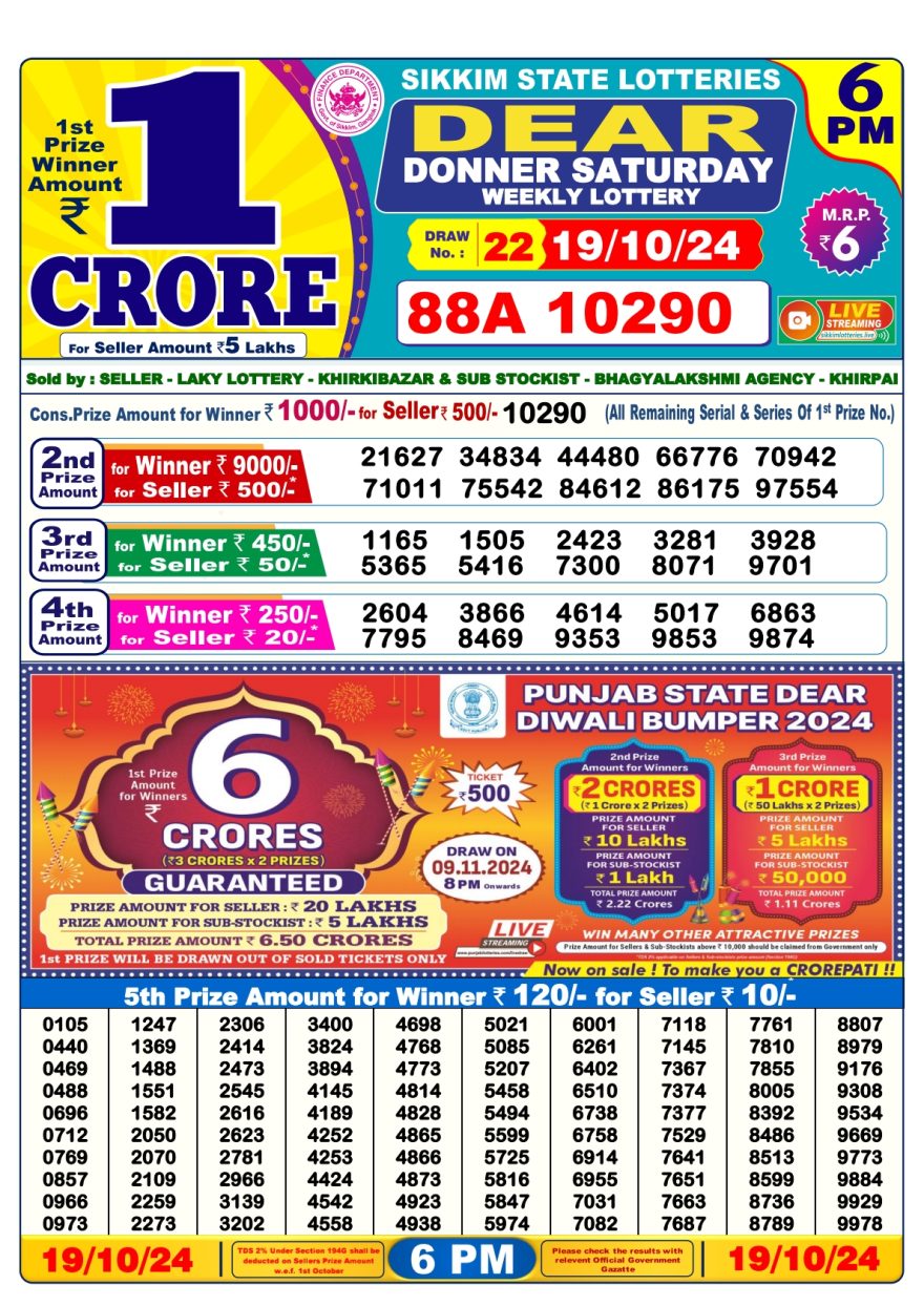 Dear donner Saturday  weekly  6PM Result 19.10.24