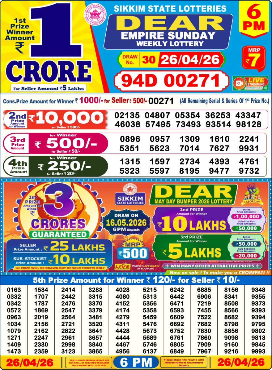 Dear Empire Sunday Weekly 6pm Result 26.04.2026