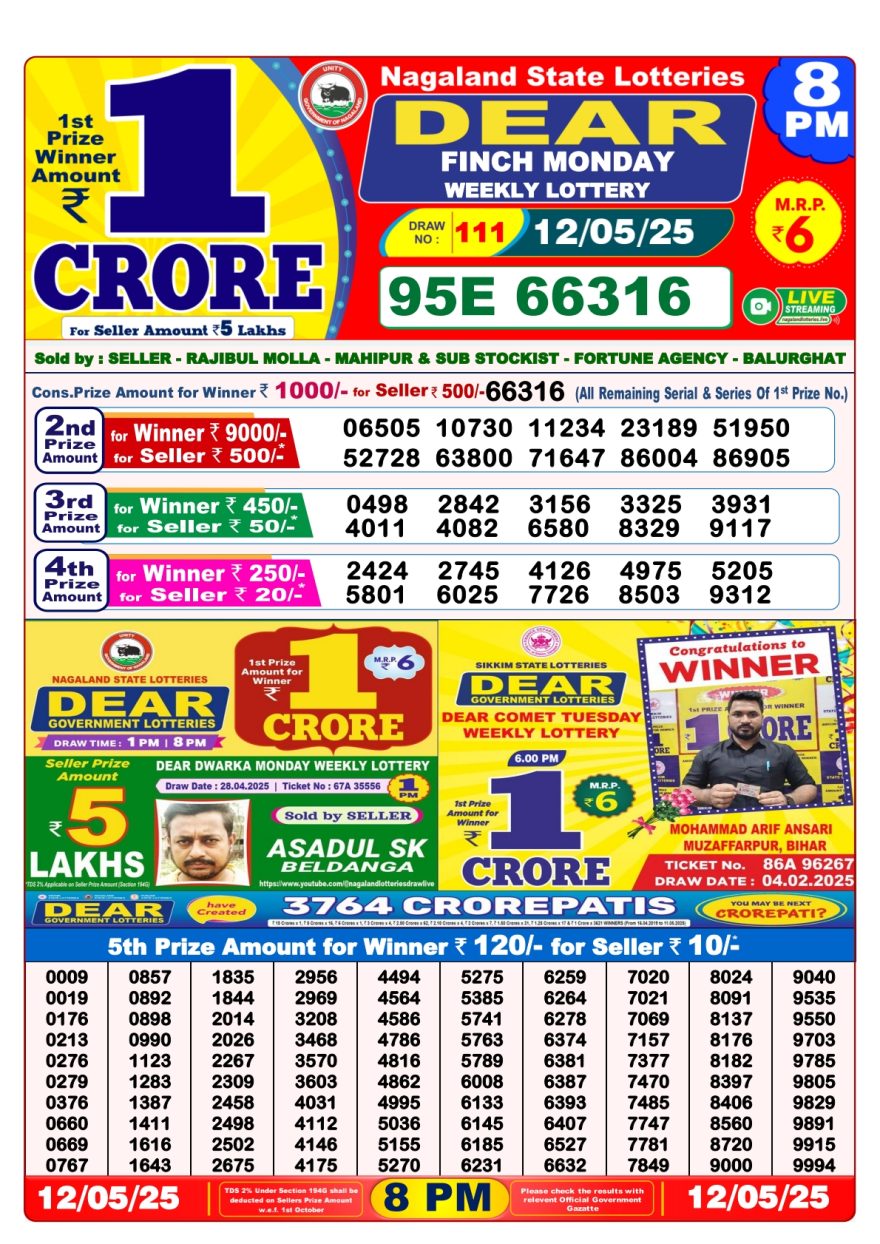Nagaland State Lotteries was established in the year 1972 under the supervision of the Finance Department to generate a dependable source of revenue for the State Government. Nagaland State Lottery is held every day of the week at three different times of the day, Morning, Day, and Evening. Every day, the lottery is held under a different name with some difference in the prize money with the top prize worth ₹1 Crore (including Super Prize amount). The daily lotteries hosted by Nagaland State include Dear Morning Lottery, Dear Day Lottery, and Dear Evening Lottery which costs 6 Rupees for each ticket.