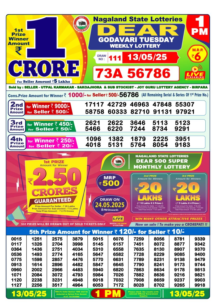 Dear godavari tuesday Weekly 1pm result 13.5.25