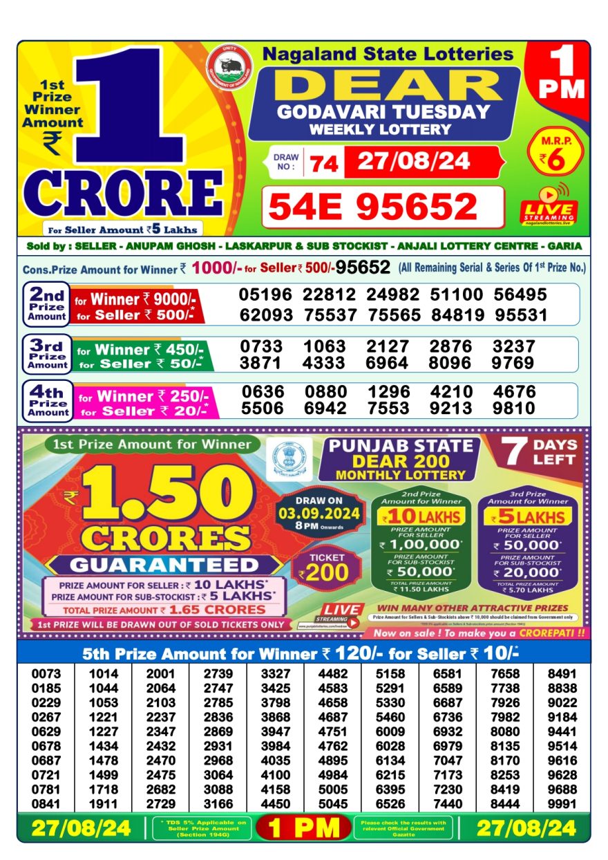 Nagaland State Lotteries was established in the year 1972 under the supervision of the Finance Department to generate a dependable source of revenue for the State Government. Nagaland State Lottery is held every day of the week at three different times of the day, Morning, Day, and Evening. Every day, the lottery is held under a different name with some difference in the prize money with the top prize worth ₹1 Crore (including Super Prize amount). The daily lotteries hosted by Nagaland State include Dear Morning Lottery, Dear Day Lottery, and Dear Evening Lottery which costs 6 Rupees for each ticket.