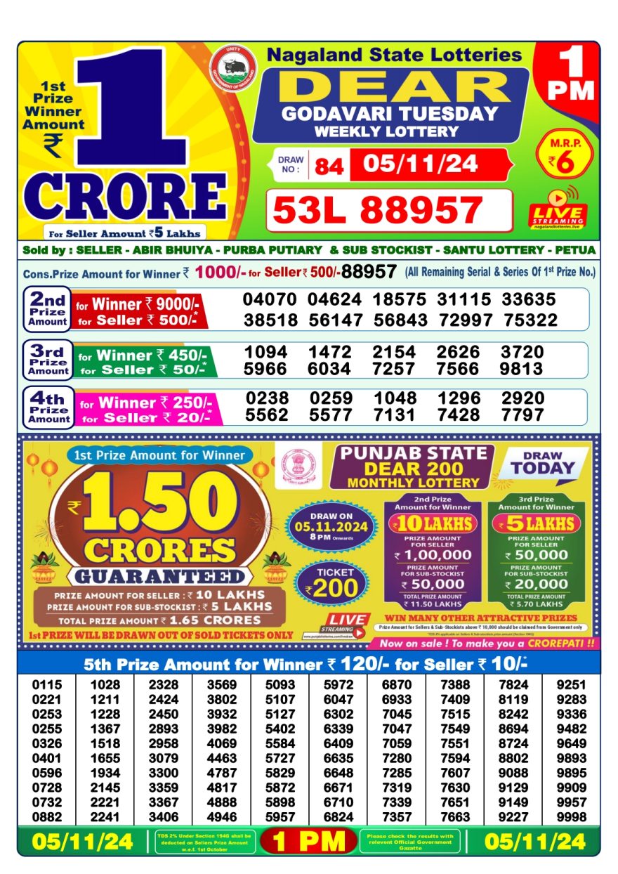 Nagaland State Lotteries was established in the year 1972 under the supervision of the Finance Department to generate a dependable source of revenue for the State Government. Nagaland State Lottery is held every day of the week at three different times of the day, Morning, Day, and Evening. Every day, the lottery is held under a different name with some difference in the prize money with the top prize worth ₹1 Crore (including Super Prize amount). The daily lotteries hosted by Nagaland State include Dear Morning Lottery, Dear Day Lottery, and Dear Evening Lottery which costs 6 Rupees for each ticket.