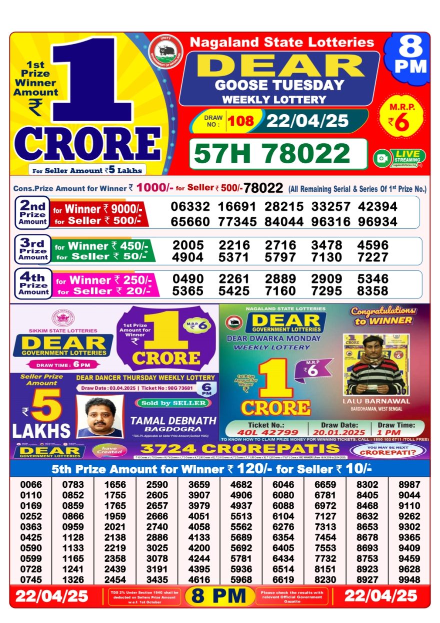 Nagaland State Lotteries was established in the year 1972 under the supervision of the Finance Department to generate a dependable source of revenue for the State Government. Nagaland State Lottery is held every day of the week at three different times of the day, Morning, Day, and Evening. Every day, the lottery is held under a different name with some difference in the prize money with the top prize worth ₹1 Crore (including Super Prize amount). The daily lotteries hosted by Nagaland State include Dear Morning Lottery, Dear Day Lottery, and Dear Evening Lottery which costs 6 Rupees for each ticket.