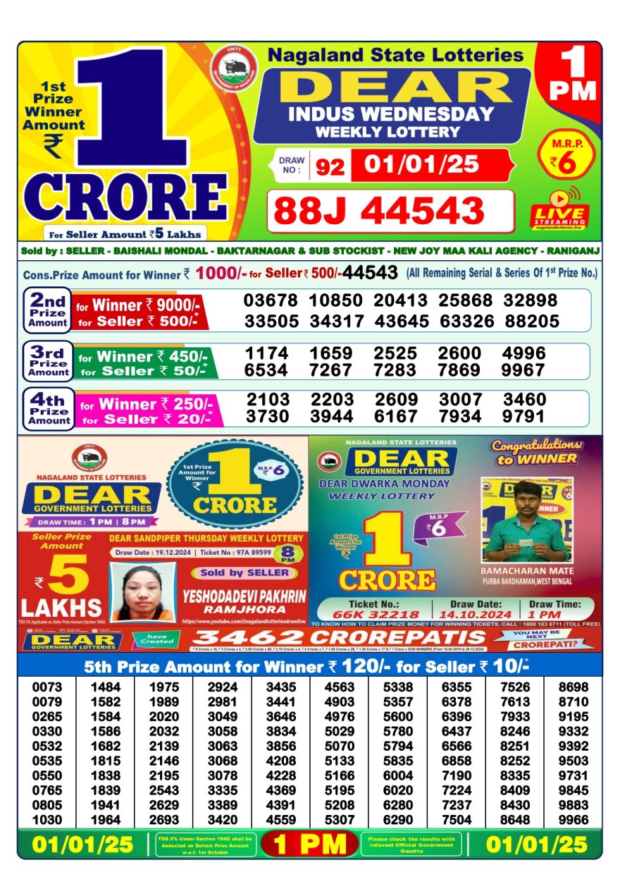 Dear Indus Wednesday Weekly 1PM Result 1.1.25