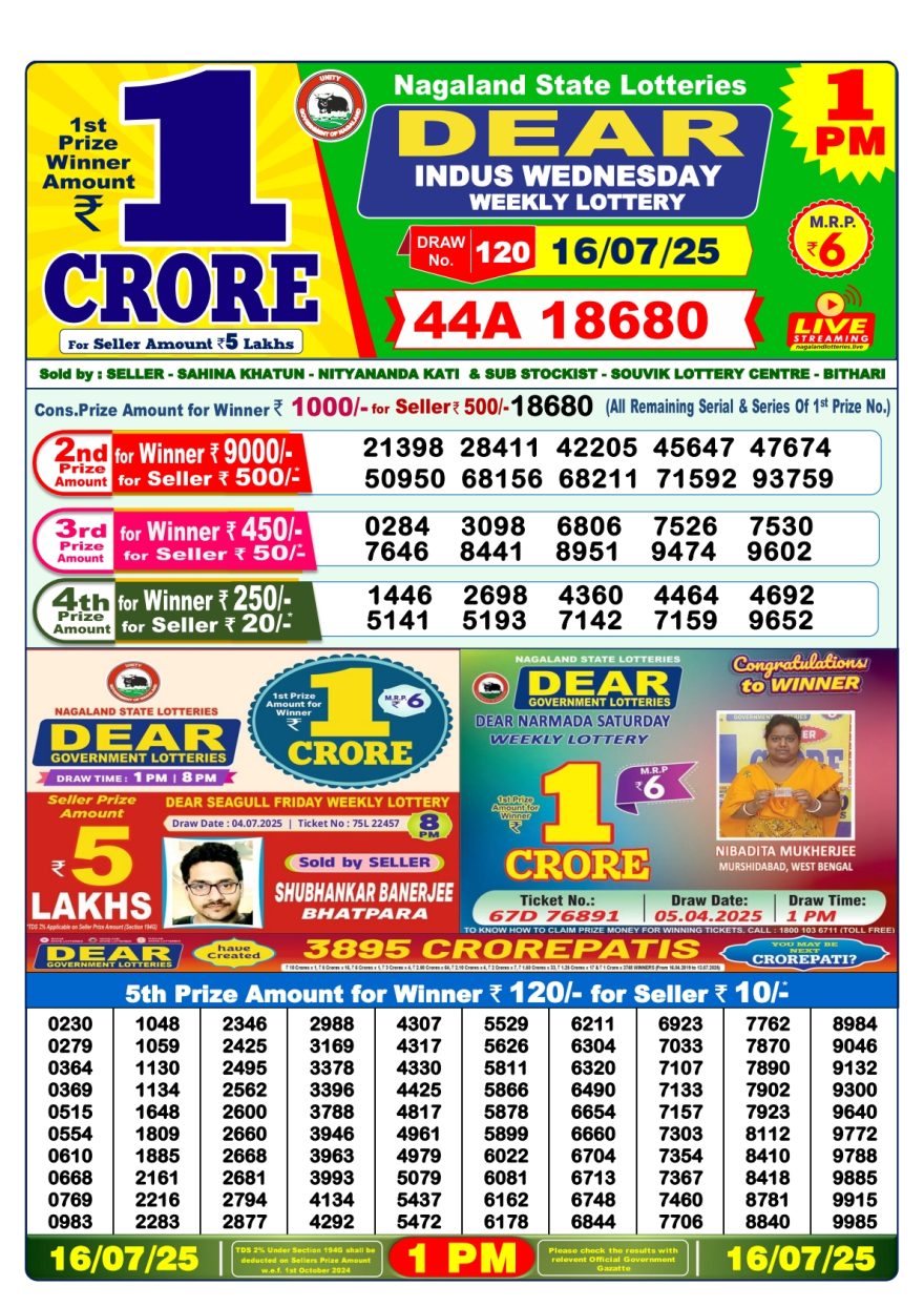 Dear Indus Wednesday Weekly 1pm result 16.07.2025
