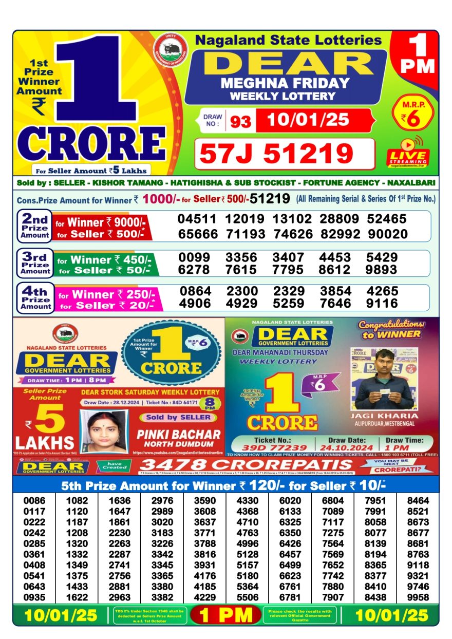 Dear mehgna Friday Weekly 1pm result 10.1.25
