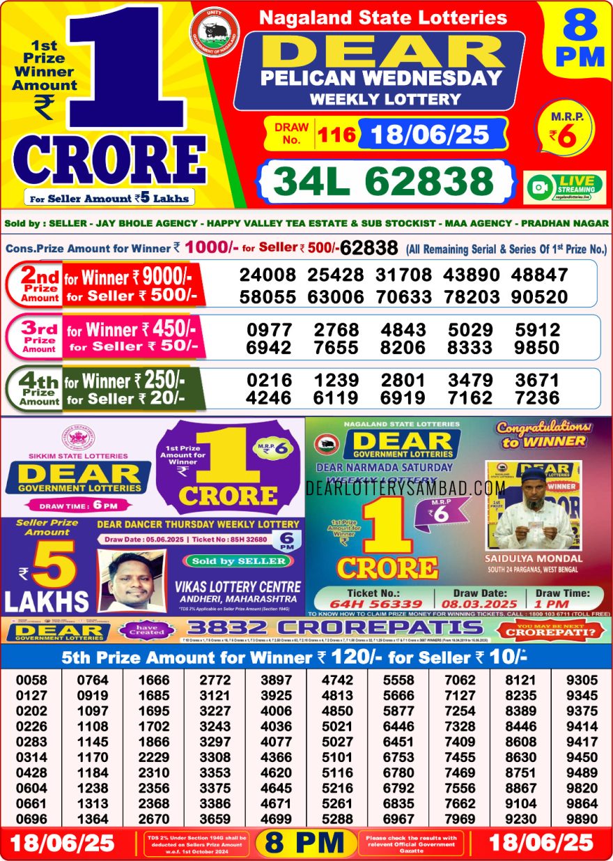 Nagaland State Lotteries was established in the year 1972 under the supervision of the Finance Department to generate a dependable source of revenue for the State Government. Nagaland State Lottery is held every day of the week at three different times of the day, Morning, Day, and Evening. Every day, the lottery is held under a different name with some difference in the prize money with the top prize worth ₹1 Crore (including Super Prize amount). The daily lotteries hosted by Nagaland State include Dear Morning Lottery, Dear Day Lottery, and Dear Evening Lottery which costs 6 Rupees for each ticket.
