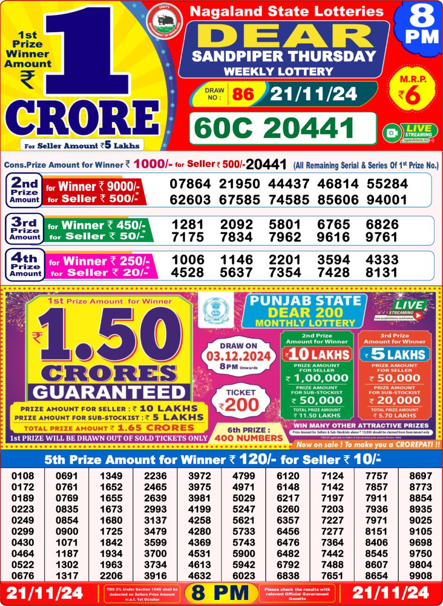 Dear sandpiper  Weekly Lottery 8PM Result 21.11.24