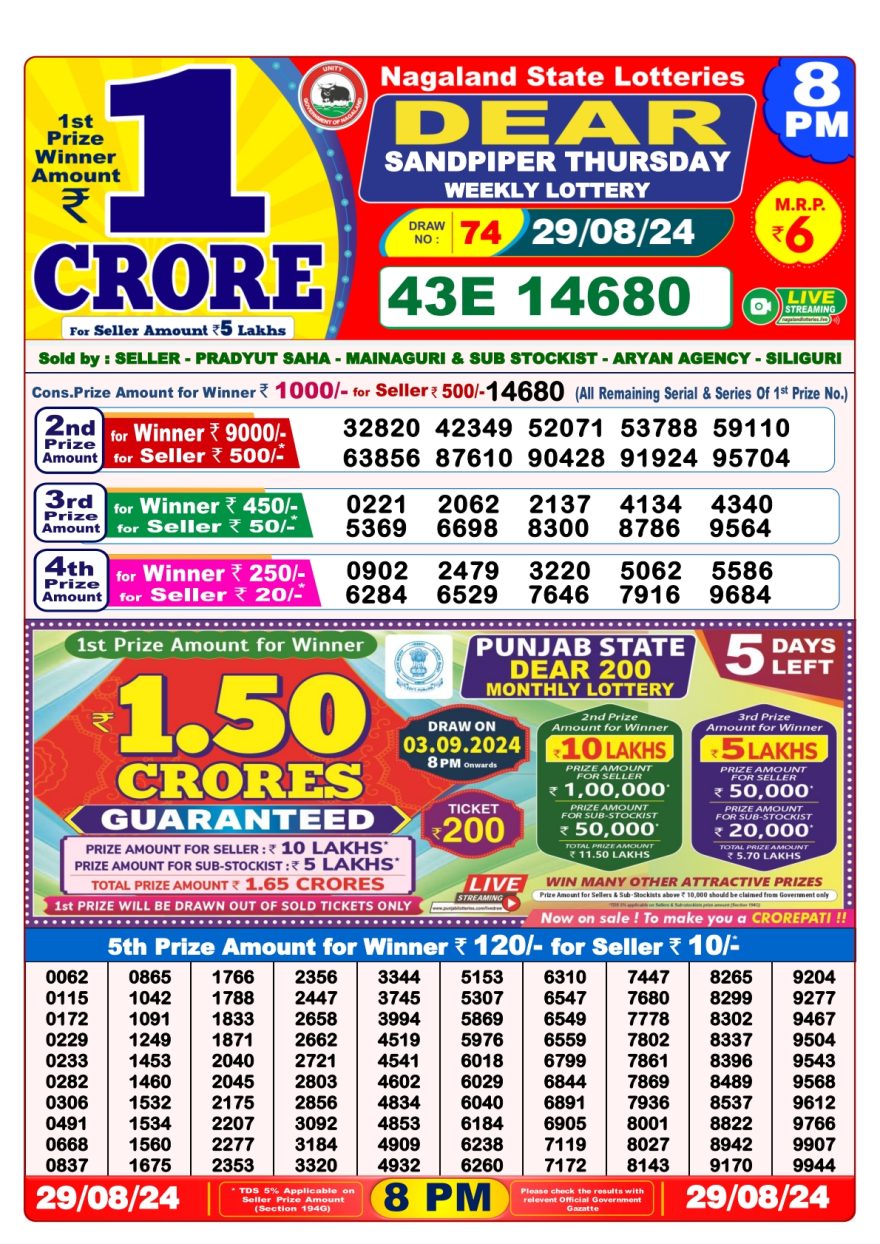 Dear sandpiper  Weekly Lottery 8PM Result 29.08.24