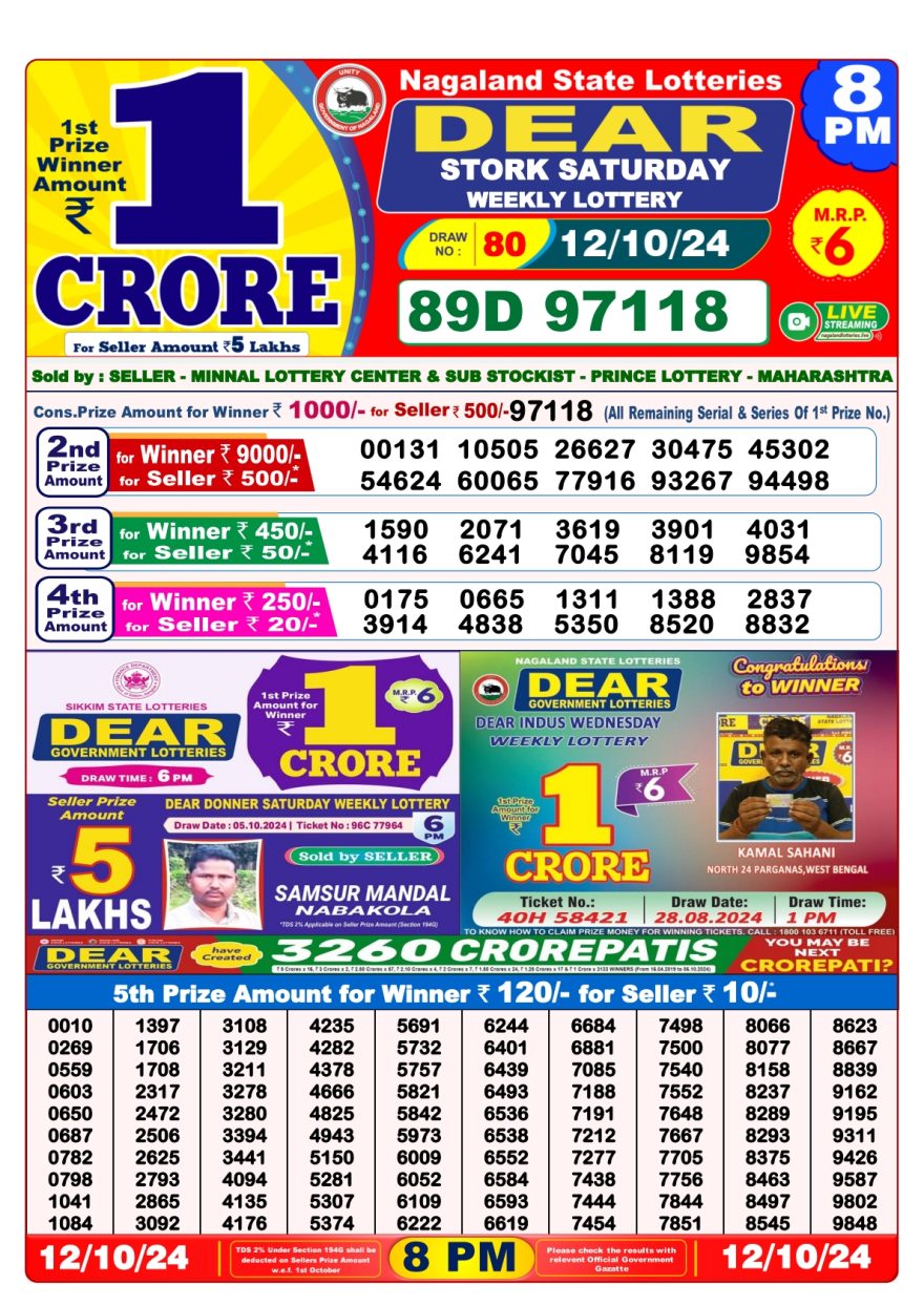 Nagaland State Lotteries was established in the year 1972 under the supervision of the Finance Department to generate a dependable source of revenue for the State Government. Nagaland State Lottery is held every day of the week at three different times of the day, Morning, Day, and Evening. Every day, the lottery is held under a different name with some difference in the prize money with the top prize worth ₹1 Crore (including Super Prize amount). The daily lotteries hosted by Nagaland State include Dear Morning Lottery, Dear Day Lottery, and Dear Evening Lottery which costs 6 Rupees for each ticket.