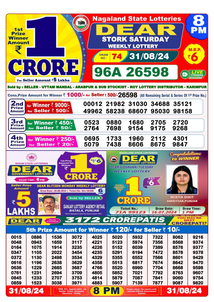 Nagaland State Lotteries was established in the year 1972 under the supervision of the Finance Department to generate a dependable source of revenue for the State Government. Nagaland State Lottery is held every day of the week at three different times of the day, Morning, Day, and Evening. Every day, the lottery is held under a different name with some difference in the prize money with the top prize worth ₹1 Crore (including Super Prize amount). The daily lotteries hosted by Nagaland State include Dear Morning Lottery, Dear Day Lottery, and Dear Evening Lottery which costs 6 Rupees for each ticket.