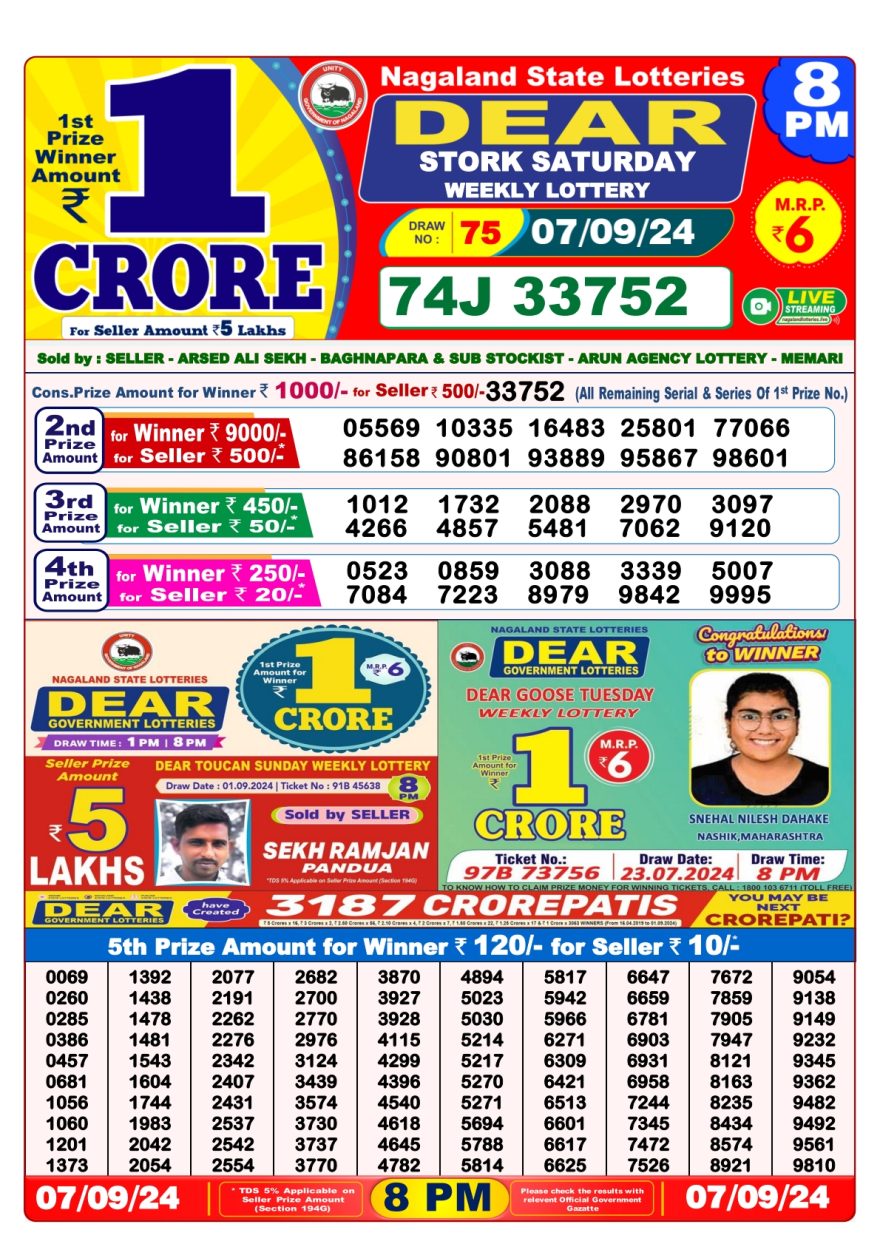 Nagaland State Lotteries was established in the year 1972 under the supervision of the Finance Department to generate a dependable source of revenue for the State Government. Nagaland State Lottery is held every day of the week at three different times of the day, Morning, Day, and Evening. Every day, the lottery is held under a different name with some difference in the prize money with the top prize worth ₹1 Crore (including Super Prize amount). The daily lotteries hosted by Nagaland State include Dear Morning Lottery, Dear Day Lottery, and Dear Evening Lottery which costs 6 Rupees for each ticket.