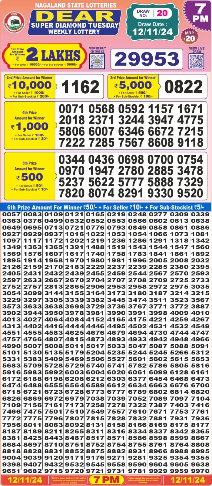 Nagaland State Lotteries was established in the year 1972 under the supervision of the Finance Department to generate a dependable source of revenue for the State Government. Nagaland State Lottery is held every day of the week at three different times of the day, Morning, Day, and Evening. Every day, the lottery is held under a different name with some difference in the prize money with the top prize worth ₹1 Crore (including Super Prize amount). The daily lotteries hosted by Nagaland State include Dear Morning Lottery, Dear Day Lottery, and Dear Evening Lottery which costs 6 Rupees for each ticket.