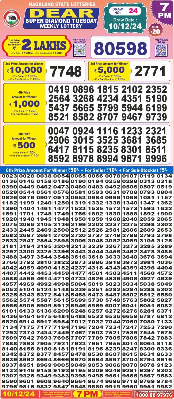 Nagaland State Lotteries was established in the year 1972 under the supervision of the Finance Department to generate a dependable source of revenue for the State Government. Nagaland State Lottery is held every day of the week at three different times of the day, Morning, Day, and Evening. Every day, the lottery is held under a different name with some difference in the prize money with the top prize worth ₹1 Crore (including Super Prize amount). The daily lotteries hosted by Nagaland State include Dear Morning Lottery, Dear Day Lottery, and Dear Evening Lottery which costs 6 Rupees for each ticket.