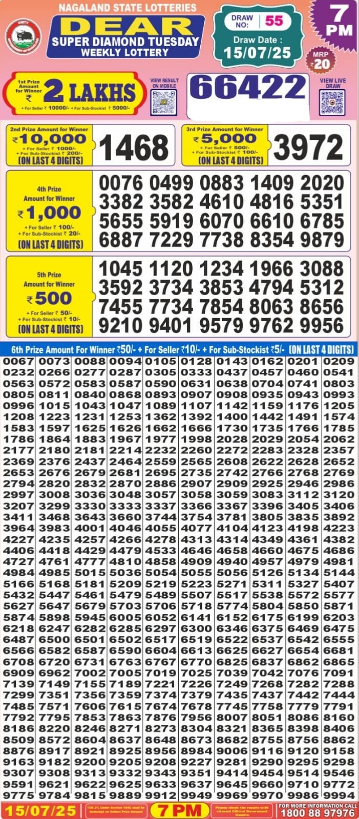Nagaland State Lotteries was established in the year 1972 under the supervision of the Finance Department to generate a dependable source of revenue for the State Government. Nagaland State Lottery is held every day of the week at three different times of the day, Morning, Day, and Evening. Every day, the lottery is held under a different name with some difference in the prize money with the top prize worth ₹1 Crore (including Super Prize amount). The daily lotteries hosted by Nagaland State include Dear Morning Lottery, Dear Day Lottery, and Dear Evening Lottery which costs 6 Rupees for each ticket.