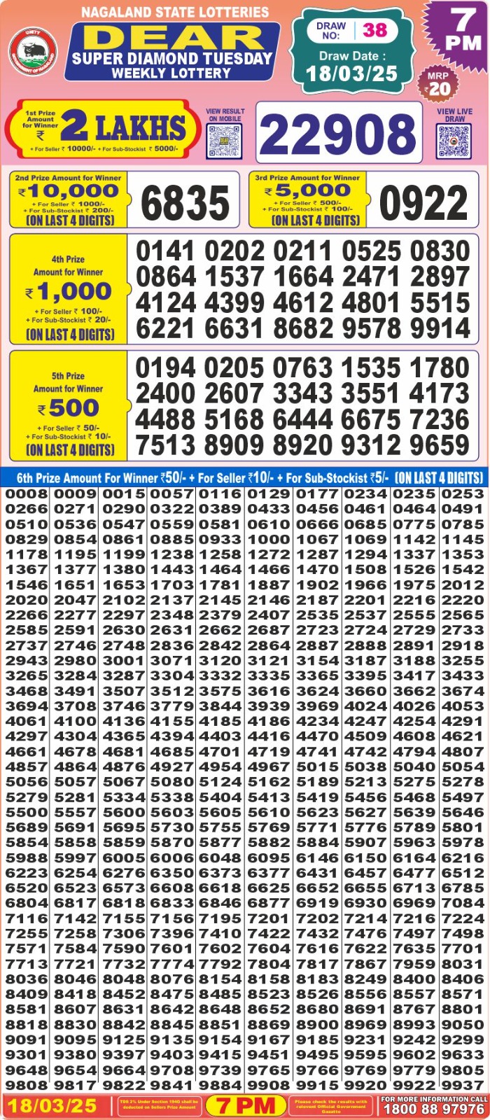 Nagaland State Lotteries was established in the year 1972 under the supervision of the Finance Department to generate a dependable source of revenue for the State Government. Nagaland State Lottery is held every day of the week at three different times of the day, Morning, Day, and Evening. Every day, the lottery is held under a different name with some difference in the prize money with the top prize worth ₹1 Crore (including Super Prize amount). The daily lotteries hosted by Nagaland State include Dear Morning Lottery, Dear Day Lottery, and Dear Evening Lottery which costs 6 Rupees for each ticket.