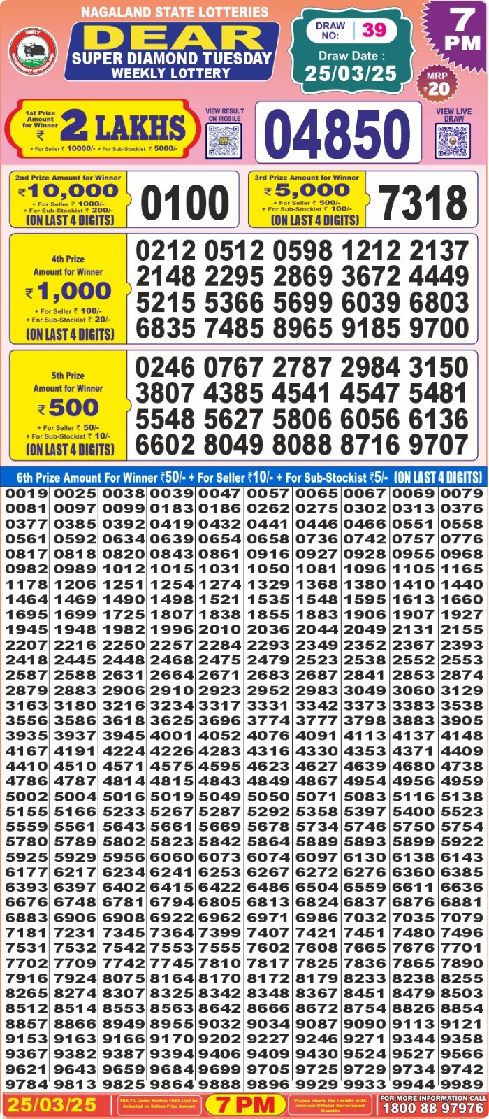 Nagaland State Lotteries was established in the year 1972 under the supervision of the Finance Department to generate a dependable source of revenue for the State Government. Nagaland State Lottery is held every day of the week at three different times of the day, Morning, Day, and Evening. Every day, the lottery is held under a different name with some difference in the prize money with the top prize worth ₹1 Crore (including Super Prize amount). The daily lotteries hosted by Nagaland State include Dear Morning Lottery, Dear Day Lottery, and Dear Evening Lottery which costs 6 Rupees for each ticket.