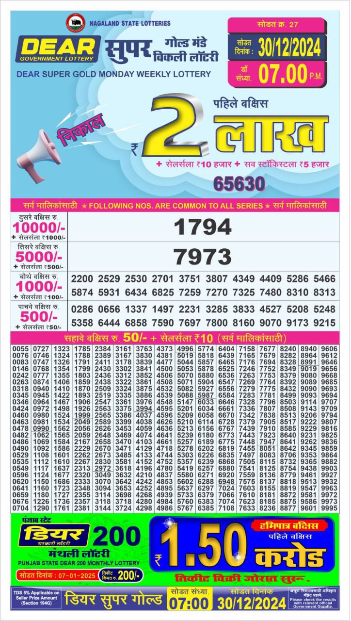 Nagaland State Lotteries was established in the year 1972 under the supervision of the Finance Department to generate a dependable source of revenue for the State Government. Nagaland State Lottery is held every day of the week at three different times of the day, Morning, Day, and Evening. Every day, the lottery is held under a different name with some difference in the prize money with the top prize worth ₹1 Crore (including Super Prize amount). The daily lotteries hosted by Nagaland State include Dear Morning Lottery, Dear Day Lottery, and Dear Evening Lottery which costs 6 Rupees for each ticket.