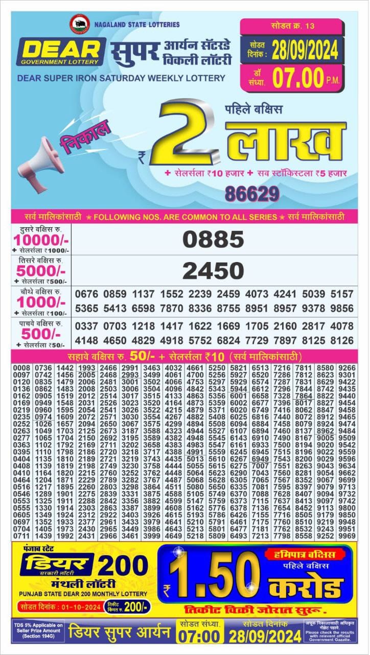 Nagaland State Lotteries was established in the year 1972 under the supervision of the Finance Department to generate a dependable source of revenue for the State Government. Nagaland State Lottery is held every day of the week at three different times of the day, Morning, Day, and Evening. Every day, the lottery is held under a different name with some difference in the prize money with the top prize worth ₹1 Crore (including Super Prize amount). The daily lotteries hosted by Nagaland State include Dear Morning Lottery, Dear Day Lottery, and Dear Evening Lottery which costs 6 Rupees for each ticket.