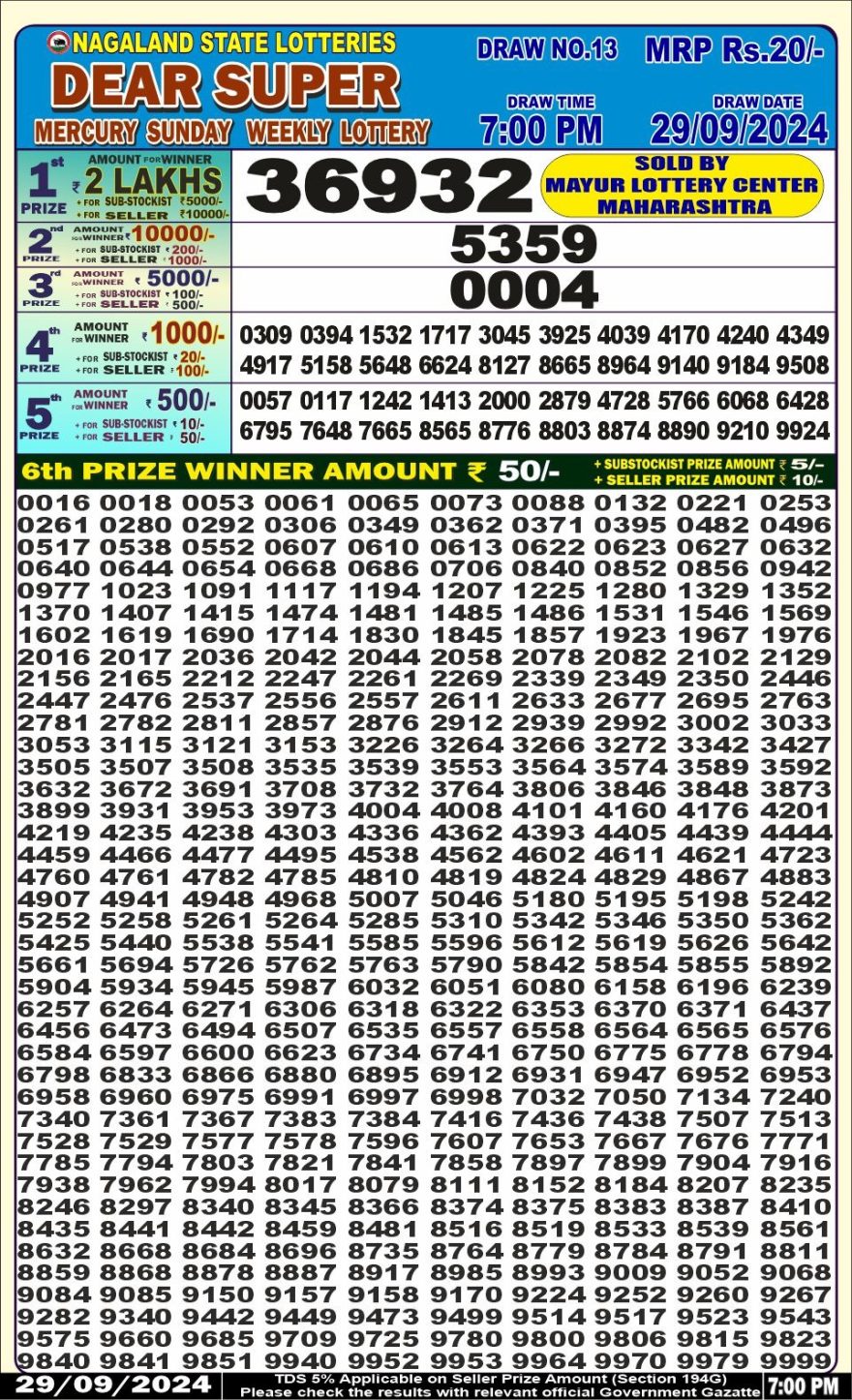 Nagaland State Lotteries was established in the year 1972 under the supervision of the Finance Department to generate a dependable source of revenue for the State Government. Nagaland State Lottery is held every day of the week at three different times of the day, Morning, Day, and Evening. Every day, the lottery is held under a different name with some difference in the prize money with the top prize worth ₹1 Crore (including Super Prize amount). The daily lotteries hosted by Nagaland State include Dear Morning Lottery, Dear Day Lottery, and Dear Evening Lottery which costs 6 Rupees for each ticket.