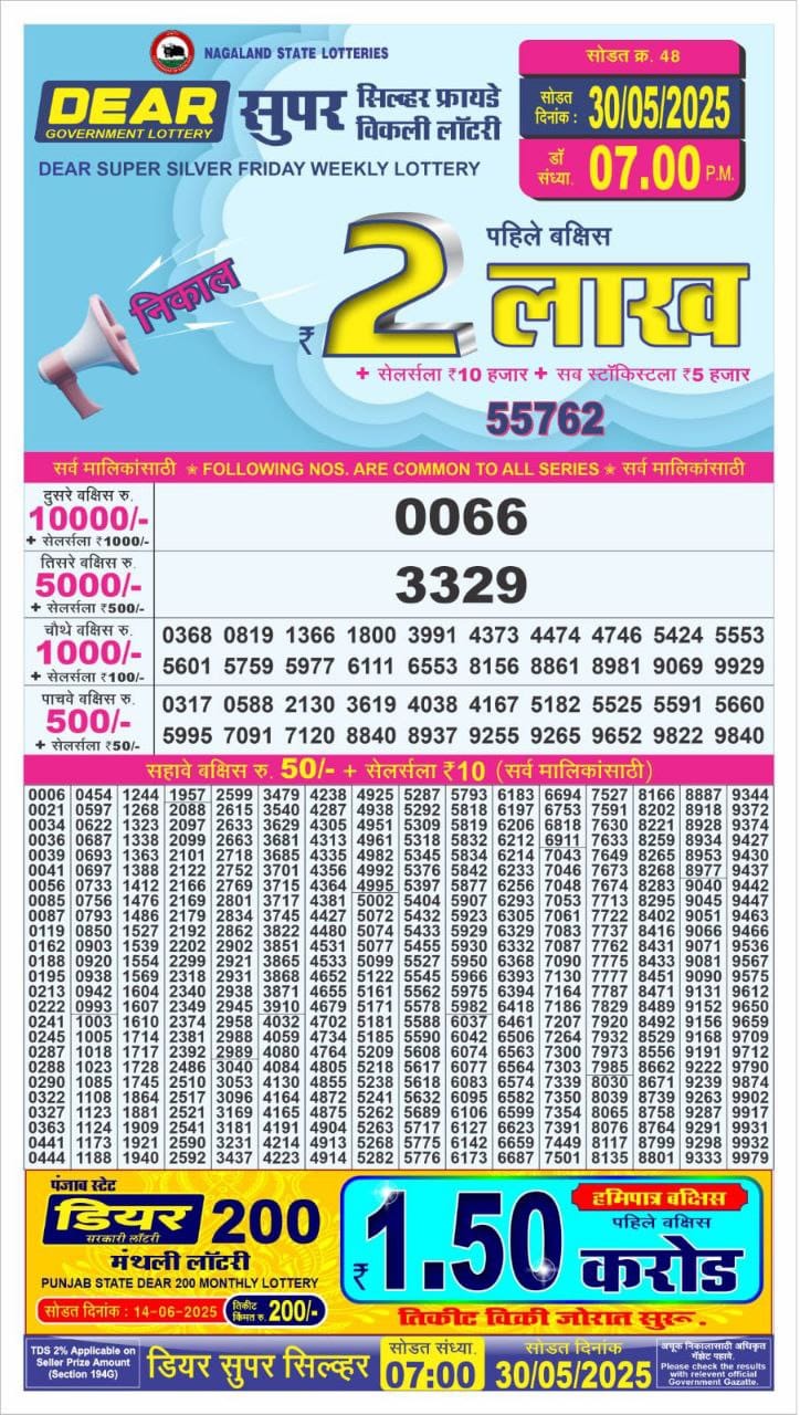 Nagaland State Lotteries was established in the year 1972 under the supervision of the Finance Department to generate a dependable source of revenue for the State Government. Nagaland State Lottery is held every day of the week at three different times of the day, Morning, Day, and Evening. Every day, the lottery is held under a different name with some difference in the prize money with the top prize worth ₹1 Crore (including Super Prize amount). The daily lotteries hosted by Nagaland State include Dear Morning Lottery, Dear Day Lottery, and Dear Evening Lottery which costs 6 Rupees for each ticket.