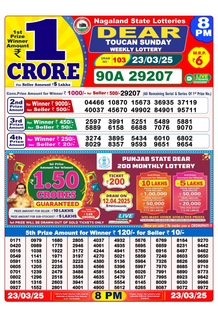 Nagaland State Lotteries was established in the year 1972 under the supervision of the Finance Department to generate a dependable source of revenue for the State Government. Nagaland State Lottery is held every day of the week at three different times of the day, Morning, Day, and Evening. Every day, the lottery is held under a different name with some difference in the prize money with the top prize worth ₹1 Crore (including Super Prize amount). The daily lotteries hosted by Nagaland State include Dear Morning Lottery, Dear Day Lottery, and Dear Evening Lottery which costs 6 Rupees for each ticket.