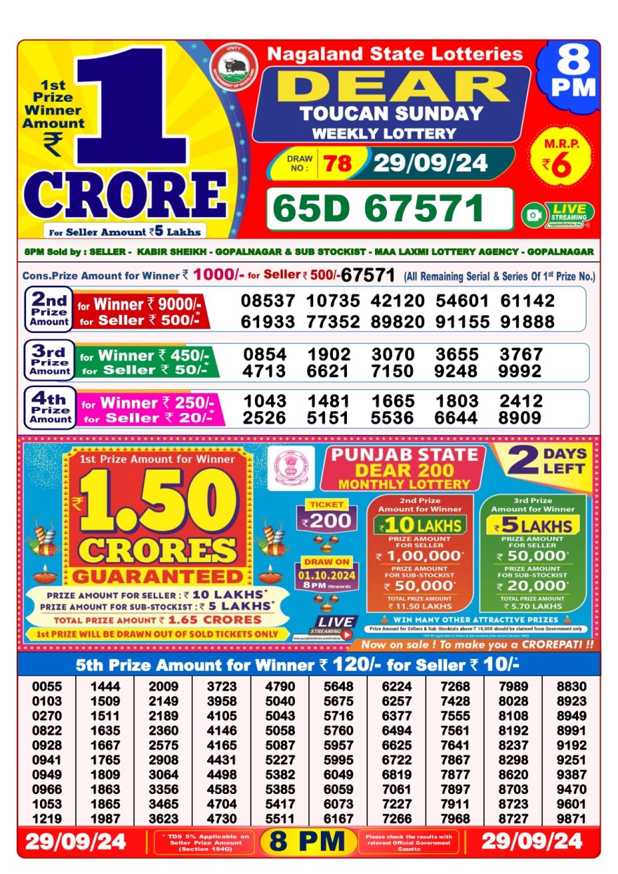 Nagaland State Lotteries was established in the year 1972 under the supervision of the Finance Department to generate a dependable source of revenue for the State Government. Nagaland State Lottery is held every day of the week at three different times of the day, Morning, Day, and Evening. Every day, the lottery is held under a different name with some difference in the prize money with the top prize worth ₹1 Crore (including Super Prize amount). The daily lotteries hosted by Nagaland State include Dear Morning Lottery, Dear Day Lottery, and Dear Evening Lottery which costs 6 Rupees for each ticket.