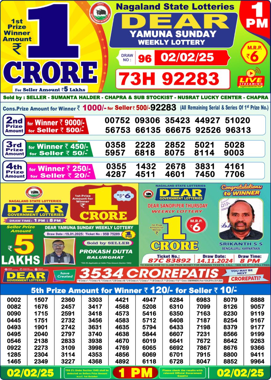 Dear yamuna sunday Weekly 1pm result 2.2.25