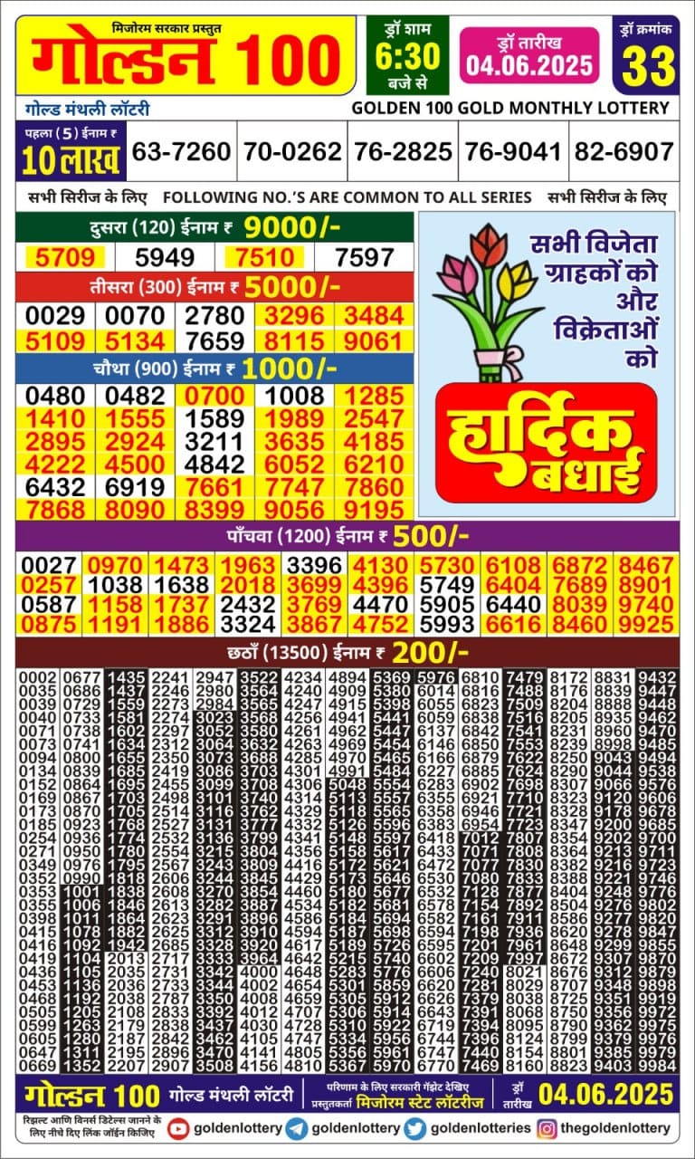 Golden 100 gold monthly lottery result 04.06.2025