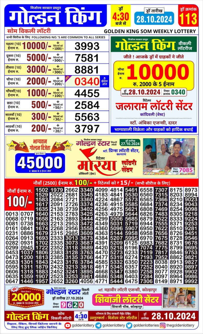 Golden king  weekly lottery 4.30pm result 28.10.24