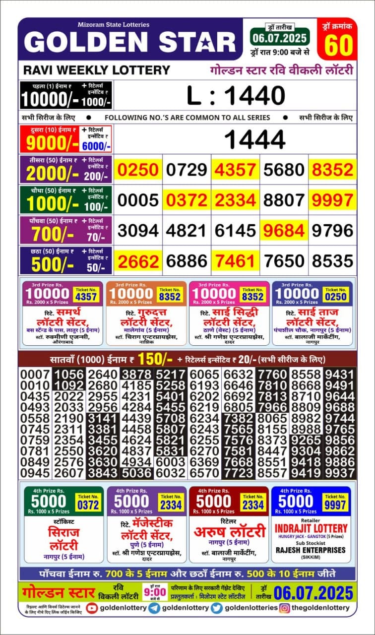 Golden Star weekly Lottery result 9pm 06.07.2025