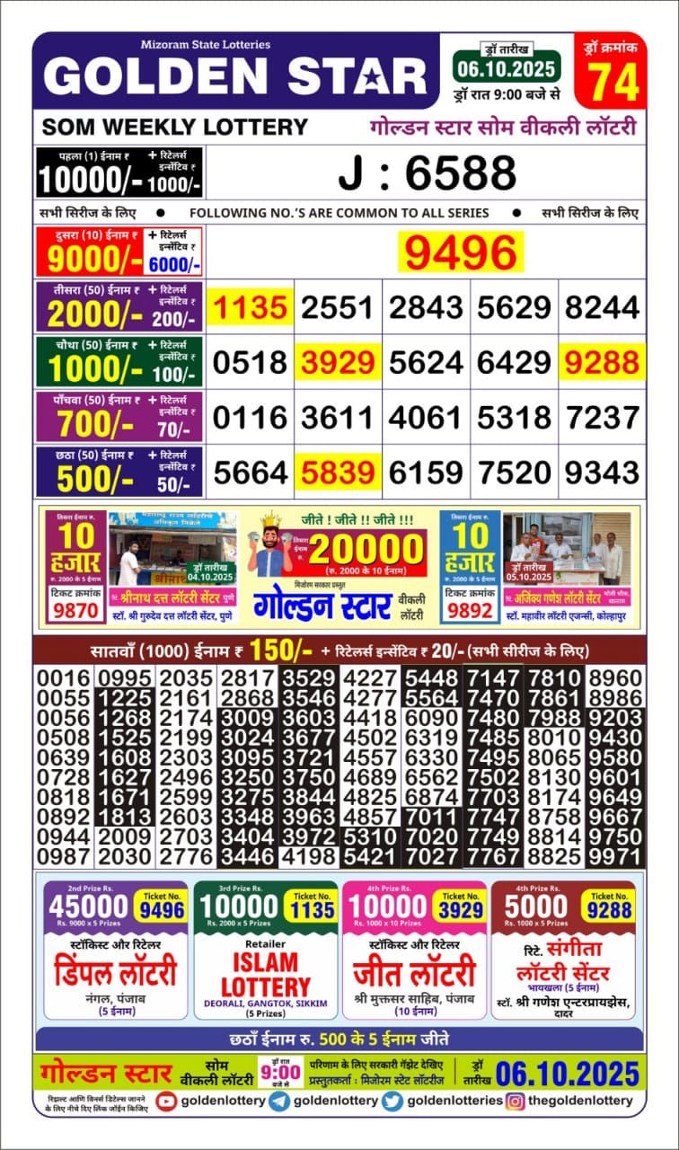 Golden Star Weekly Lottery Result 9pm 06.10.2025