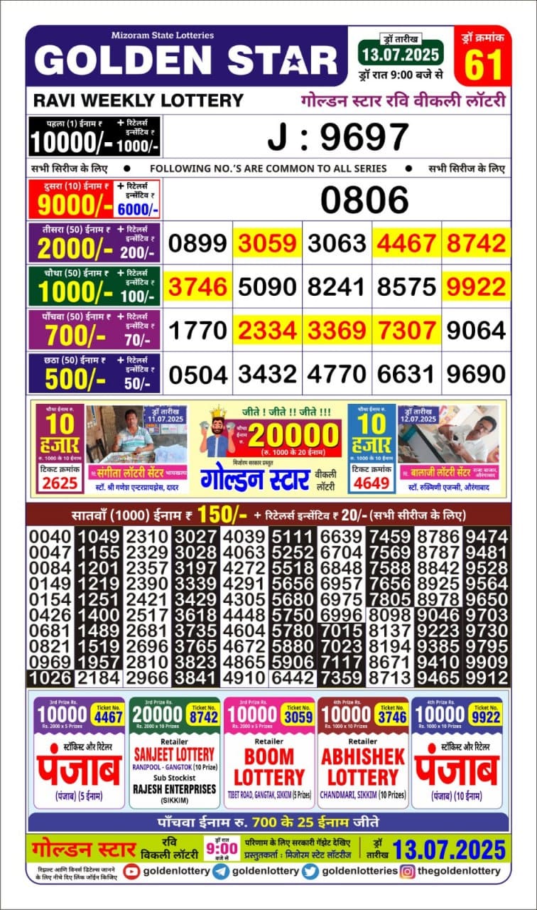 Golden Star weekly Lottery result 9pm 13.07.2025